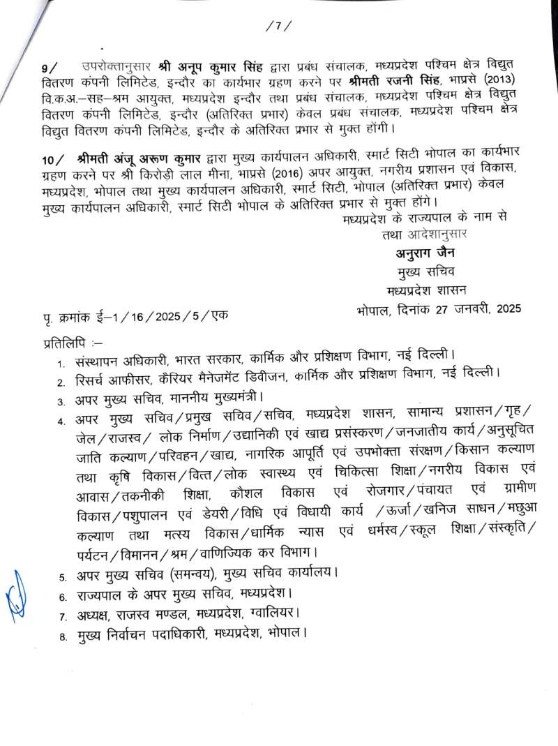 मुख्यमंत्री के सचिव भरत यादव को मध्य प्रदेश सड़क विकास निगम का प्रबंध संचालक बनाया गया है, जबकि उनके स्थान पर सीबी चक्रवर्ती एम को मुख्यमंत्री डॉ. मोहन यादव का सचिव बनाया गया है। इसी तरह आईएएस अधिकारी ललित कुमार को राजस्व मंडल ग्वालियर का सदस्य, अविनाश लवानिया को मध्य प्रदेश पावर मैनेजमेंट कंपनी लिमिटेड जबलपुर का प्रबंध संचालक, वंदना वेद को आदिम जाति क्षेत्र विकास योजना का संचालक, सत्येंद्र सिंह को एमपी स्टेट कोऑपरेटिव डेयरी फेडरेशन लिमिटेड का प्रबंध संचालक, मनीष सिंह को जेल और मध्य प्रदेश परिवहन विभाग का सचिव बनाया गया है। इसी तरह कलेक्टर खरगोन कर्मवीर शर्मा को आयुक्त सह संचालक खाद्य नागरिक आपूर्ति निगम की जिम्मेदारी दी गई है।