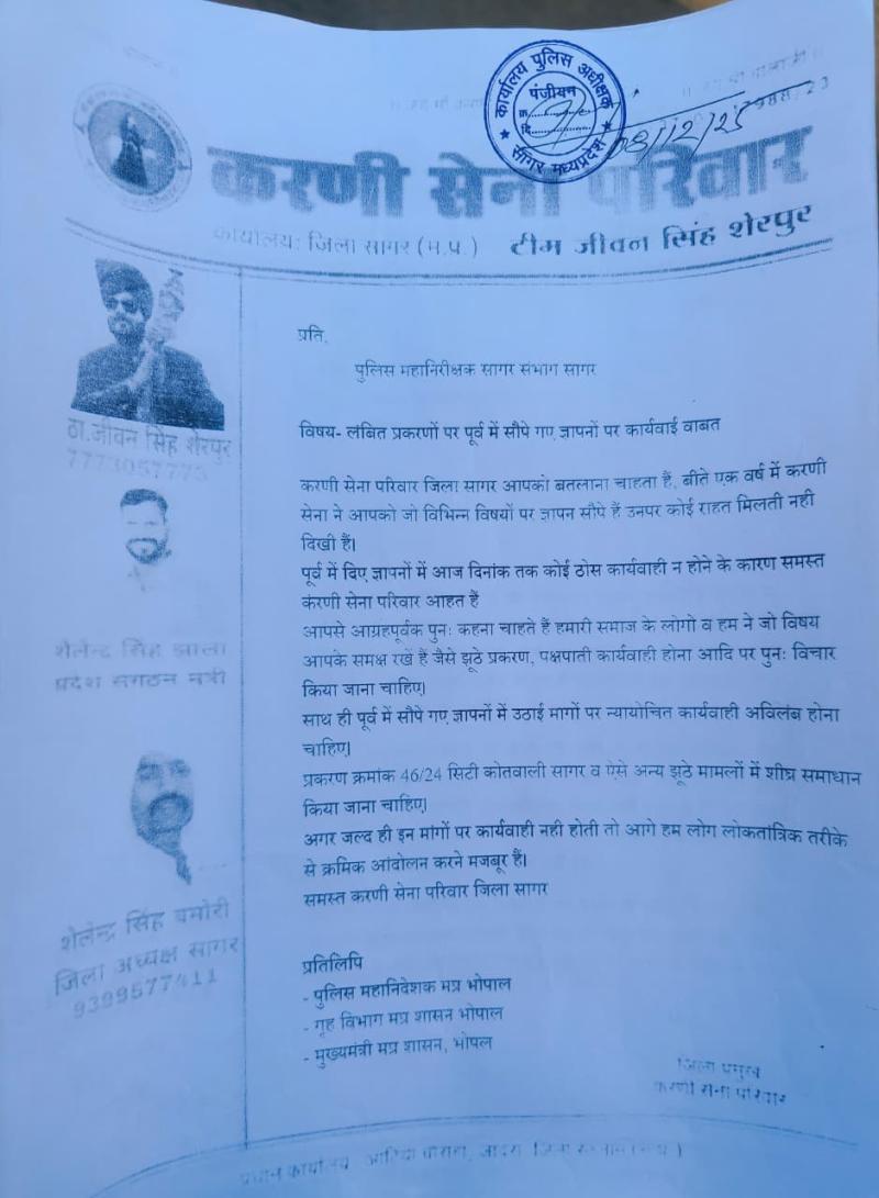 सागर। आज दिनांक 8 दिसंबर 2025 को करणी सेना परिवार के सदस्यों ने बड़ी संख्या में एसपी कार्यालय में प्रदर्शन किया एवं "रघुपति राघव राजा राम "का कीर्तन पुलिस को चिर निद्रा से जगाने के लिए किया। करणी सैनिकों के आरोप हैं कि पुलिस अधीक्षक विकाश शहवाल और अतिरिक्त पुलिस अधीक्षक लोकेश सिन्हा को पूर्व में अपनी मांगों के चलते सौपे गए ज्ञापनों पर आज दिनांक तक कोई ठोस कार्यवाही नही की गई। करणी सेना परिवार जिला सागर द्वारा 1 वर्ष की अवधि में दिए गए करीब 6 ज्ञापनों में पुलिस प्रशासन द्वारा कोई भी निराकरण नही किये जाने के विरोध में करणी सैनिको ने पुलिस अधीक्षक कार्यालय के बाहर धरना प्रदर्शन किया और रघुपति राघव राजा राम का कीर्तन किया। करणी सेना ने बताया है कि अभी आंशिक धरना प्रदर्शन किया जा रहा हैं, अगर उक्त माँगे नही मानी जाती तो जीवन सिंह शहपुरा की मंशा अनुसार बड़े स्तर पर प्रदर्शन किया जाएगा।