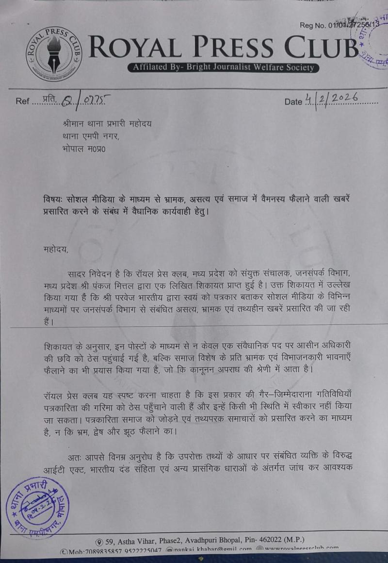 भोपाल। शहर में जनसंपर्क अधिकारी (PRO) को जबरन अपने प्रभाव में लेने का प्रयास, मनगढ़ंत आरोप लगाने और सोशल मीडिया के माध्यम से तत्वहीन आरोपों को वायरल करने का मामला सामने आया है। इन घटनाओं को गंभीरता से लेते हुए जनसंपर्क अधिकारी ने रॉयल प्रेस क्लब को पत्र लिखकर पूरे घटनाक्रम की जानकारी दी। अपने पत्र में जनसंपर्क अधिकारी ने उल्लेख किया कि कुछ लोग स्वयं को पत्रकार बताकर न केवल उन पर दबाव बनाने का प्रयास कर रहे हैं, बल्कि निराधार और भ्रामक आरोप लगाकर उनकी छवि धूमिल करने की कोशिश भी कर रहे हैं। उन्होंने कहा कि इस प्रकार की गतिविधियां पत्रकारिता की गरिमा को ठेस पहुंचाती हैं और ऐसे लोग पत्रकार समाज को कलंकित कर रहे हैं। पत्र में उन्होंने प्रेस क्लब से आग्रह किया कि ऐसे व्यक्तियों का बहिष्कार किया जाए और उनके विरुद्ध आवश्यक कानूनी कार्रवाई सुनिश्चित की जाए। पत्र प्राप्त होने के बाद रॉयल प्रेस क्लब ने भी मामले को गंभीरता से लेते हुए संपूर्ण जानकारी लिखित रूप में एमपी नगर थाने को प्रेषित की। क्लब ने पुलिस से मांग की है कि मामले की निष्पक्ष जांच कर उचित कानूनी कार्रवाई की जाए। साथ ही, भ्रामक खबरें फैलाने के आरोप में *परवेज नामक व्यक्ति के विरुद्ध शिकायत दर्ज कर जल्द से जल्द सूचना प्रौद्योगिकी (आईटी) एक्ट के तहत मामला दर्ज करने की मांग भी की गई है।