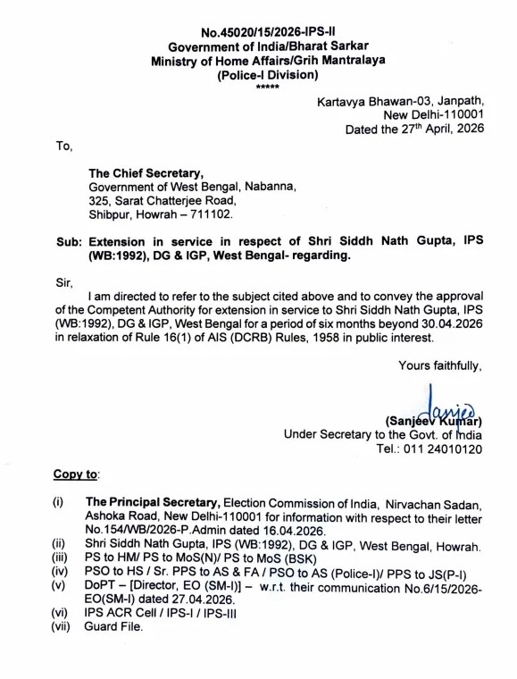 कोलकाता। पश्चिम बंगाल विधानसभा चुनाव 2026 के निर्णायक मोड़ पर केंद्र सरकार का यह फैसला राज्य की सुरक्षा व्यवस्था और चुनावी स्थिरता को लेकर एक बड़ा संकेत है। 29 अप्रैल को होने वाले दूसरे चरण के मतदान और 4 मई की मतगणना से ठीक पहले प्रशासन में निरंतरता बनाए रखने के लिए डीजीपी सिद्ध नाथ गुप्ता का सेवा विस्तार अत्यंत महत्वपूर्ण माना जा रहा है।